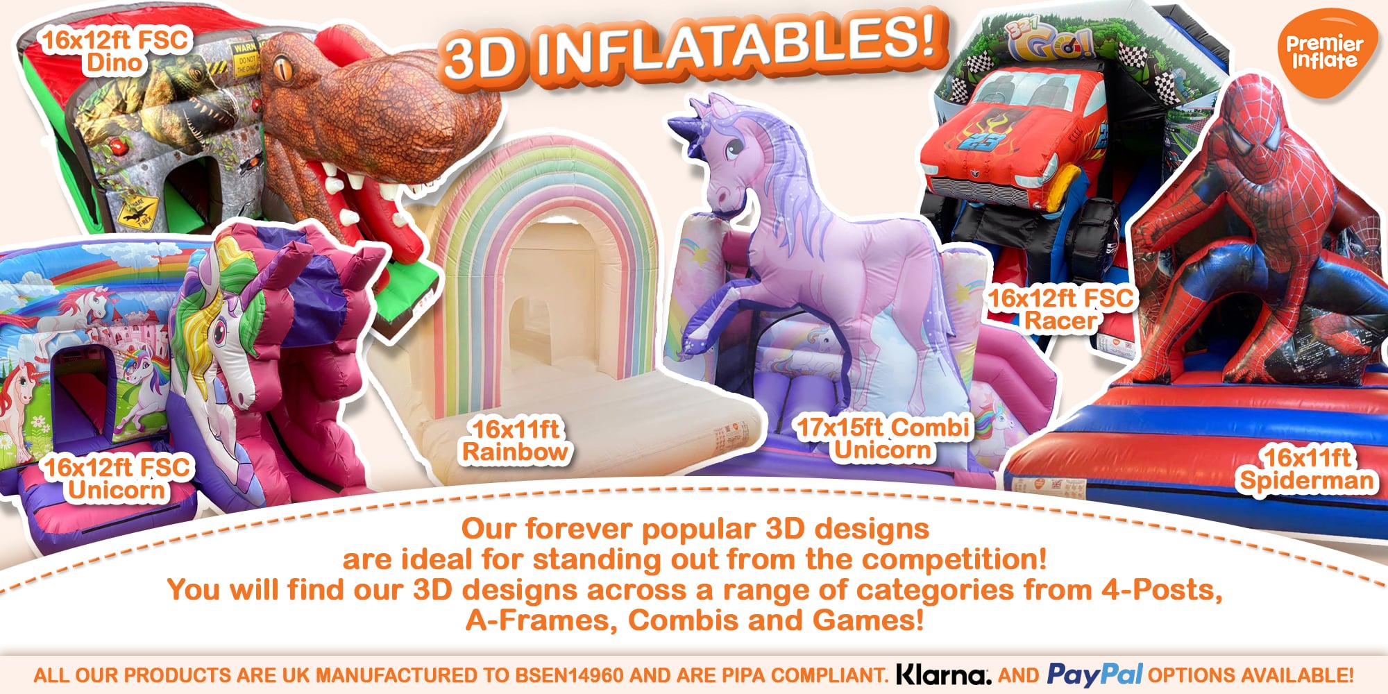 3D Commercial Bouncy Castles for sale from Premier Inflate. Premier Inflate are one of the UK's largest manufacturers of top quality Bouncy Castles and Inflatables for Sale at affordable prices. We pride ourselves on bringing new and innovative products to the market, providing commercial and robust inflatables with great customer service. We have a wide range of 3D Inflatables for Sale which can all be manufactured to your specification such as size, style, design, theme etc. No job is too big or small. All our inflatables are made using top of the range commercial machines, commercial materials and made with care. Dont forget we also manufacture Adults Bouncy Castles which can be done as a 3D Design - no project is too big or small.