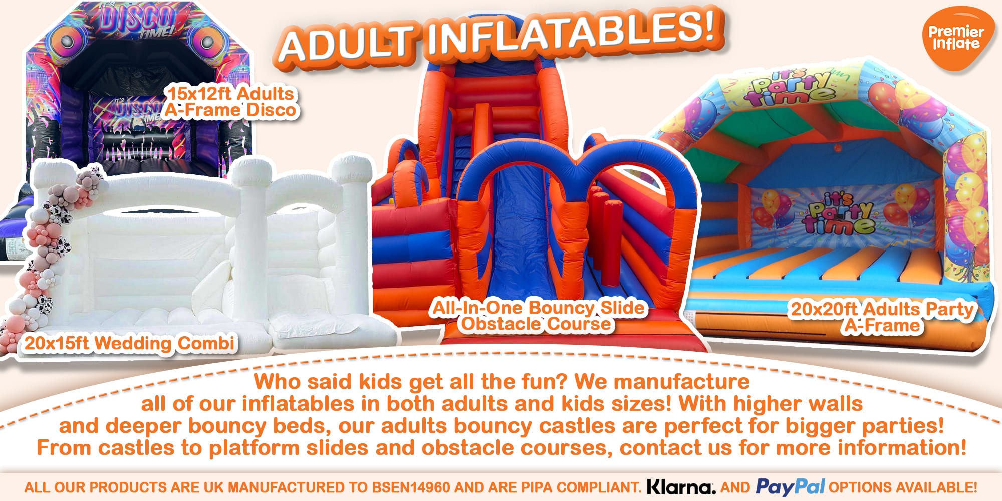 Our bouncy Castles for adults are ideal for opening up your market base and are great for events such as birthday parties, weddings and so much more, we’ve a huge range available of inflatable fun for adults to choose from. Though the larger size makes them ideal for adults to use, they are suitable for children too.