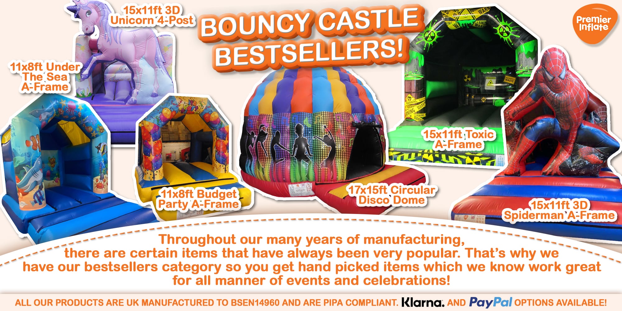 Check out our range of current Best Selling Bouncy Castles and Inflatables from Premier Inflate. All our bouncy castles and inflatables are manufactured for commercial use at our UK based premises and come with a 3 year warranty so you can have confidence that you are buying a good quality products.