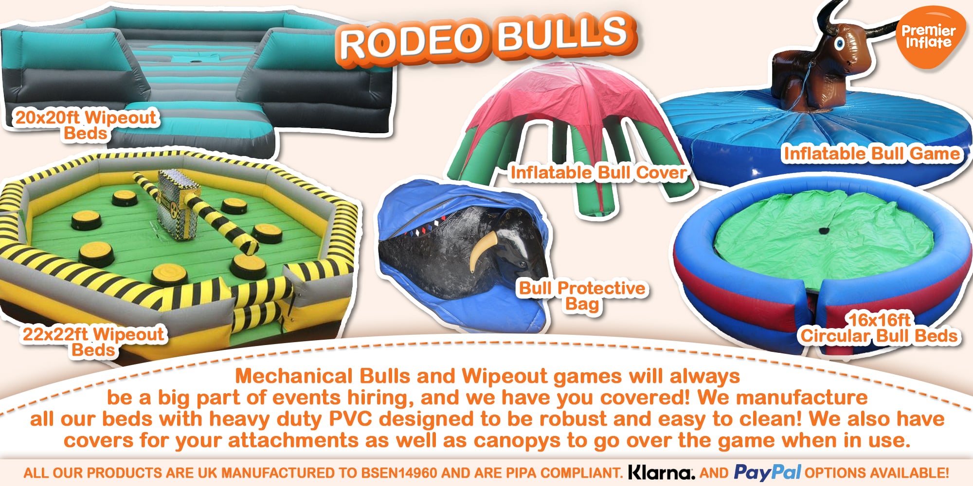 Premier Inflate are excited to confirm we now have a range of Mechanical Rides and Games for Sale which include Rodeo Bull & Attachments, Wipe Out and So much More. With a number of different packages to choose from we have you covered - no longer will you need to purchase your Mechanical ride and Inflatable Bed separately everything is available to buy from Premier Inflate. With top quality products at affordable prices you wont need to look anywhere else!
