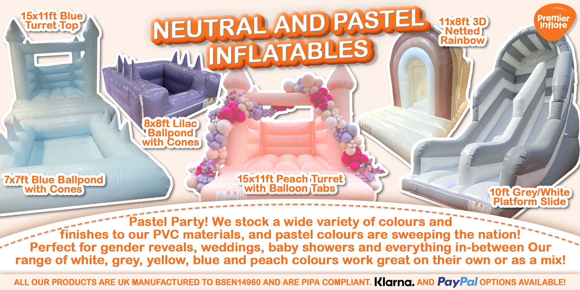 We have a wide range of Neutral and Pastel coloured Commercial Bouncy Castles for Sale which is consistently growing all of which are manufactured by our team at our UK Factory. If you would like to come and see the quality of our bouncy castles and inflatables please feel free to contact us and arrange an appointment with one of our sales team. We currently have a range of pastel and neutral coloured bouncy castles such as yellow, peach, blue, grey and white which are becoming more and more popular and Premier Inflate are looking to expand on their range of pastel colours throughout 2023. Looking for a New Pastel Bouncy Castle for Sale? Then look no further than Premier Inflate one of the UK's largest manufacturers or top quality Pastel Bouncy Castles for Sale at affordable Prices. We have bouncy castles available for both children and adults, with sizes ranging up to 20ft! If you haven’t found what you’re looking for on our website, we can manufacture bespoke bouncy castles! please feel free to contact us, we are always able to manufacture a new inflatable design, specifically for you. Want to get a bouncy castle at a cheaper price or just love a deal then dont forget to check our Bouncy Castle Sale section with lots of items in stock and discounted.