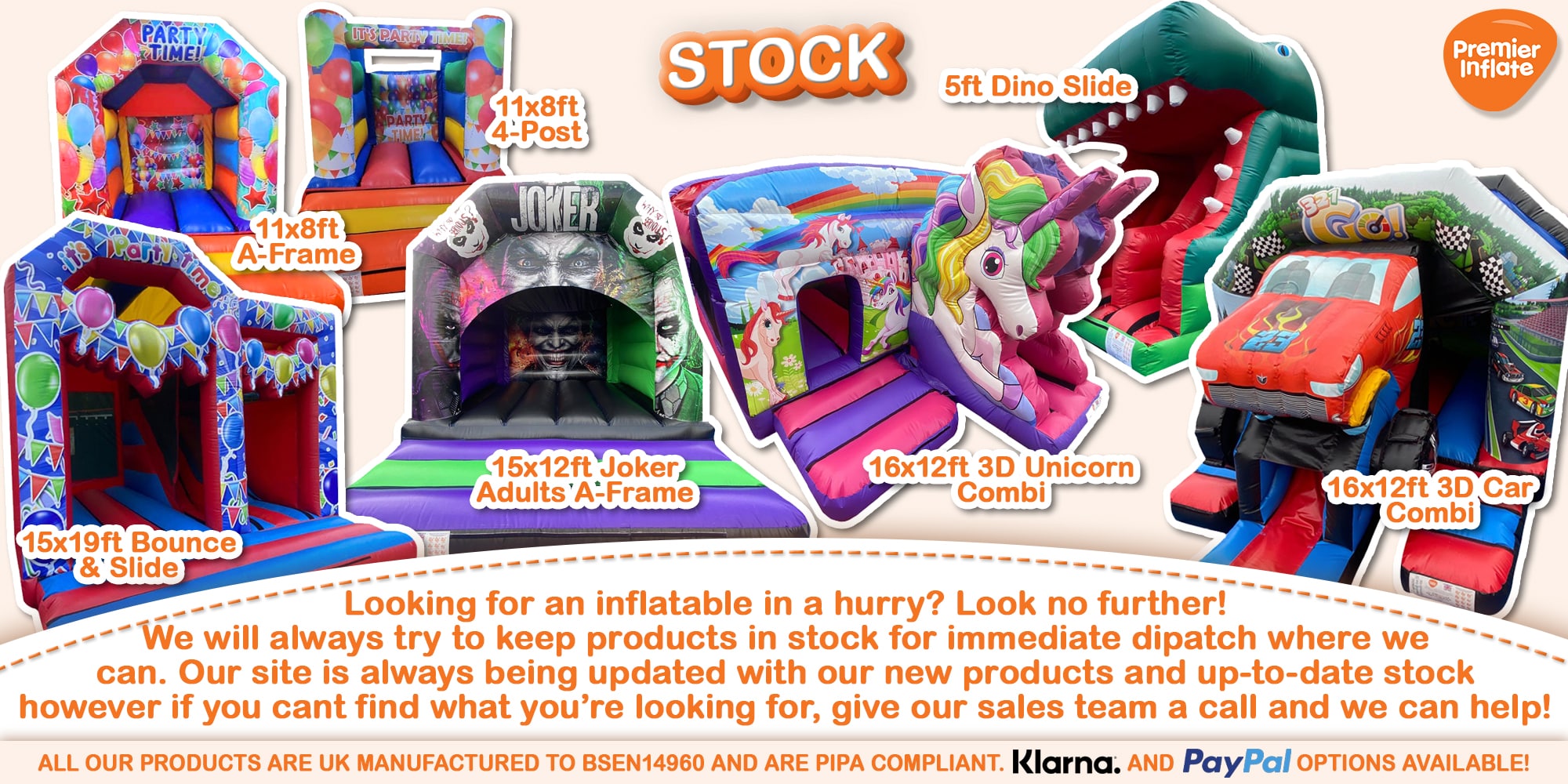 Are you looking for a Bouncy Castle in a hurry? We have a wide selection of stock available to look through which includes bouncy castles, soft play, inflatable marquees and much more. We have stock on hand which is available for immediate dispatch and all of it is brand new, unused just waiting to be delivered. Because its in stock we can offer it at a discounted price so not only do you get your order in a quick time you also get it cheaper than if you ordered something bespoke. All items are manufactured by Premier Inflate at our UK factory so its all still top quality and built for commercial use. We try and get an accurate picture of the item you will be purchasing but in some instances it may be similar colours / artwork. Please feel free to contact us to discuss our stock items and to make sure its still available.