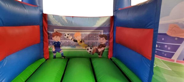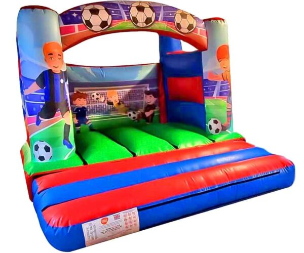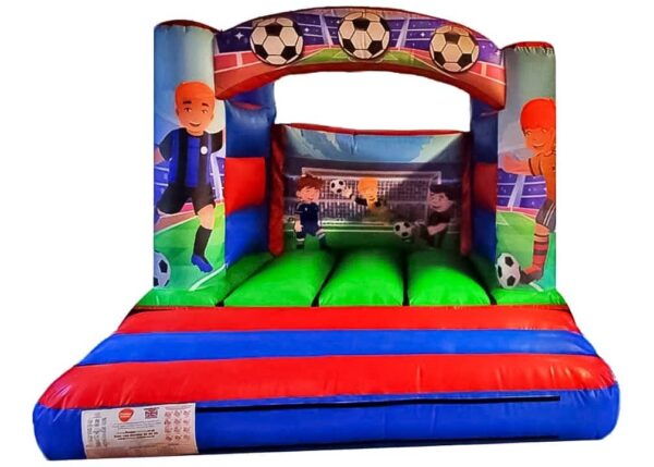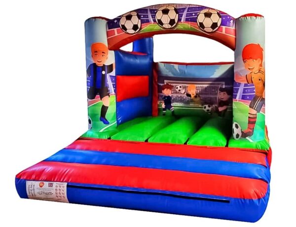 10x12ft Curved Arch Football Bouncy Castle for Sale. This perfect little bouncy castle is manufactured with digitally printed football artwork and suitable colour scheme, making it ideal for boys. The 4 post design makes it perfect for indoor as well as outdoor hires.