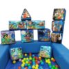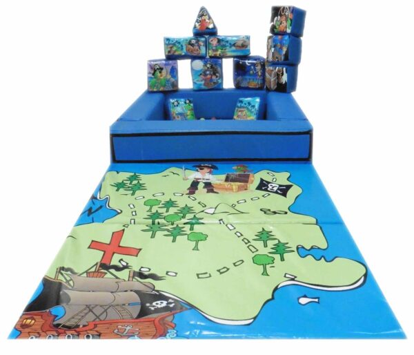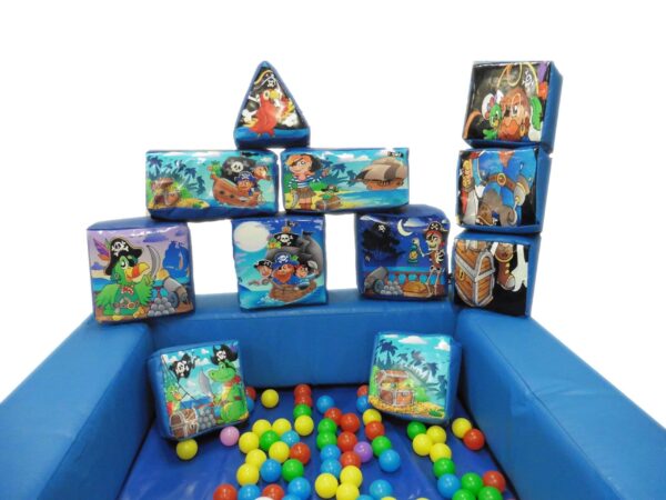 15 Piece Pirate Themed Soft Play Set with Ball Pond for Sale. Soft Play Set includes 15 pieces of foam shapes with Lego printed artwork, 4x4ft Foam Ball Pond, Digitally Printed Safety Mat and a carry bag to store and transport your soft play shapes.