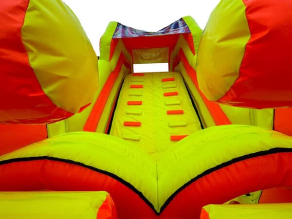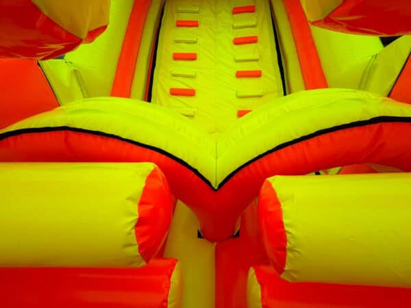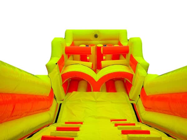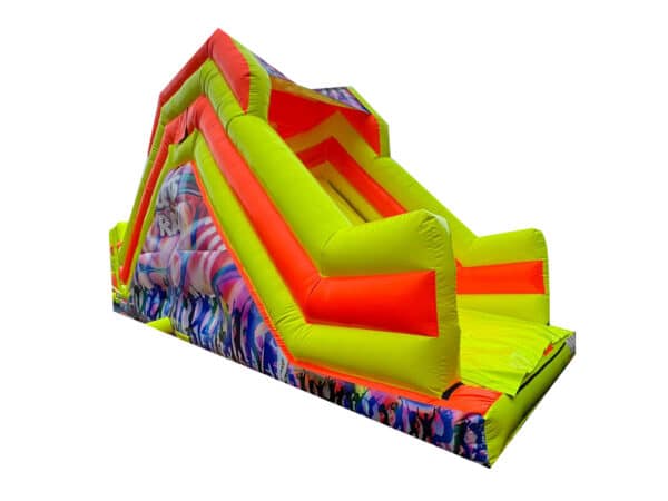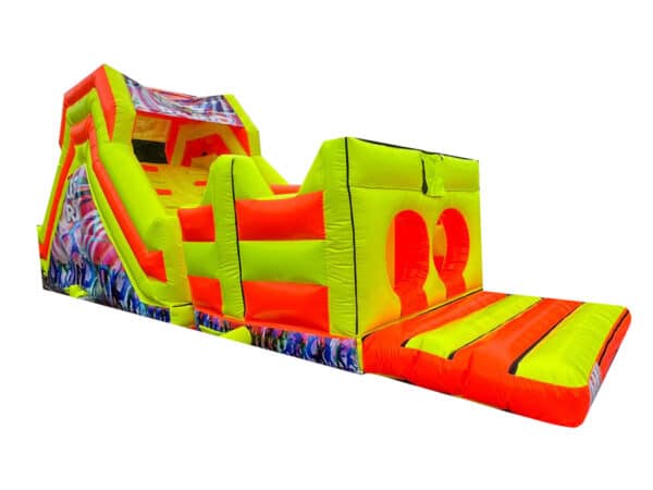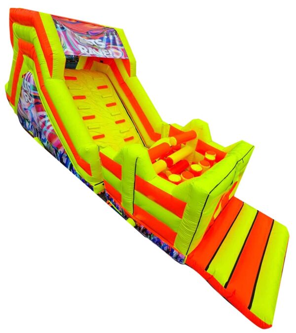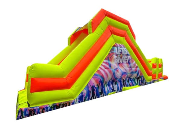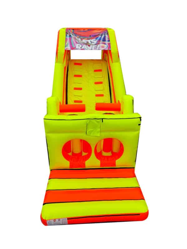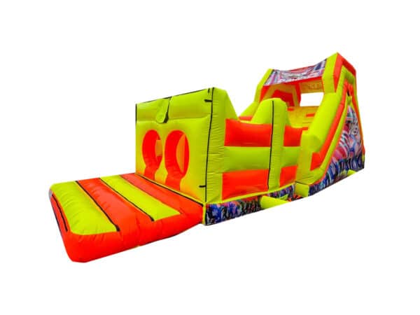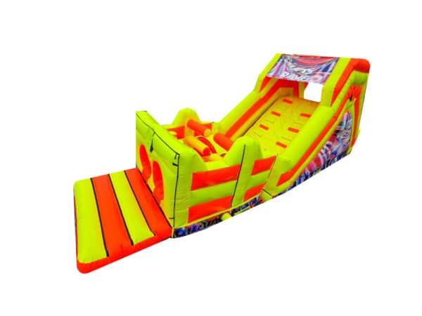 This is the perfect obstacle course for kids with its bold and vibrant fluorescent colours, featuring stunningly vibrant rave themed artwork making this slide easily stand out at any event. Make sure you get your hands on our great fluorescent UV range of inflatables, a new and hot item to add to any hire fleet! Featuring an up & over 10ft. Slide and Bouncy Obstacle first part with internal Biff & Bash pillars & Tunnels. This Inflatable Bouncy Ob Course to buy comes in two pieces which are connected via Velcro.