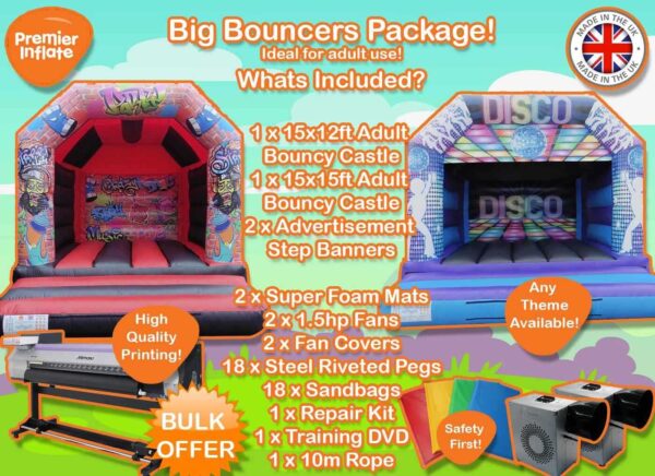 Super Adults Bouncy Castle Package deal available to buy which includes two adult bouncy castles with digitally printed artwork available in ANY THEME. Includes all the accessories shown and listed in the picture so its all ready for set up / hire as soon as its been delivered.