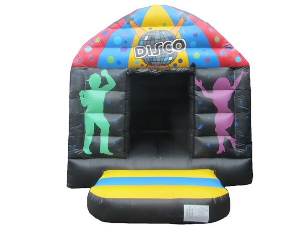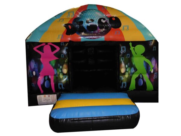 15x12 ft. Adults Disco Jumping Bouncy Castle dome available to buy. A fully enclosed jumping bouncer with dark effect inside which features front flap door and colourful unisex front design. Children & adults go wild for our Disco Party bouncy castles which include LED disco ball light & Bluetooth Speaker system which plays music directly into the inflatable bounce house for extra fun & excitement. Ideal for back garden use. These style bouncers are a manageable weight which are easy to handle and will fit into the rear of a car. Perfect for both boys and girls. This Castle can be made to your specifications i.e. choice of colours, size, style of artwork and can also include your business contact details.