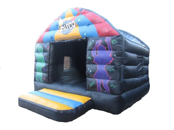 15x12 ft. Commercial Disco Bouncy Castle dome for sale which features a fully blackout internal design. A massively popular design and great for both boys and girls. Includes LED disco Light & Bluetooth speaker system.