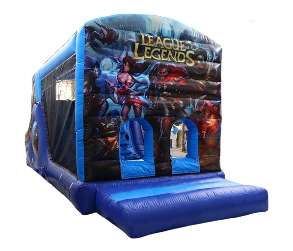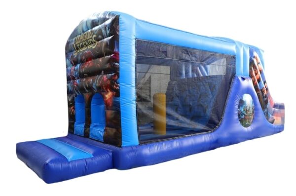 28x10 ft. Up & Over Legends fully enclosed Bouncy Obstacle Course with digitally printed artwork which is available to buy in a variety of colours & themes! This robust commercial design features a variety of internal obstacles as well as Up & over slide complete with detachable slip & climb sheets. This Bouncy Obstacle course features fully netted sides.