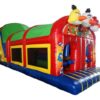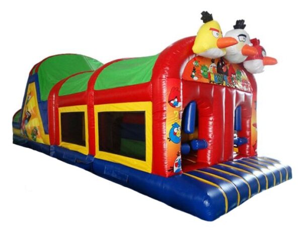 36x11 ft. Commercial Heavy duty Deluxe Naughty Birds Bouncy Castle Obstacle Course for sale with vibrant colour scheme & digitally printed artwork which is jam packed with a variety of inflatable obstacles inside. Complete with a 7ft. Platform up & over slide with slip & climb sheets included.