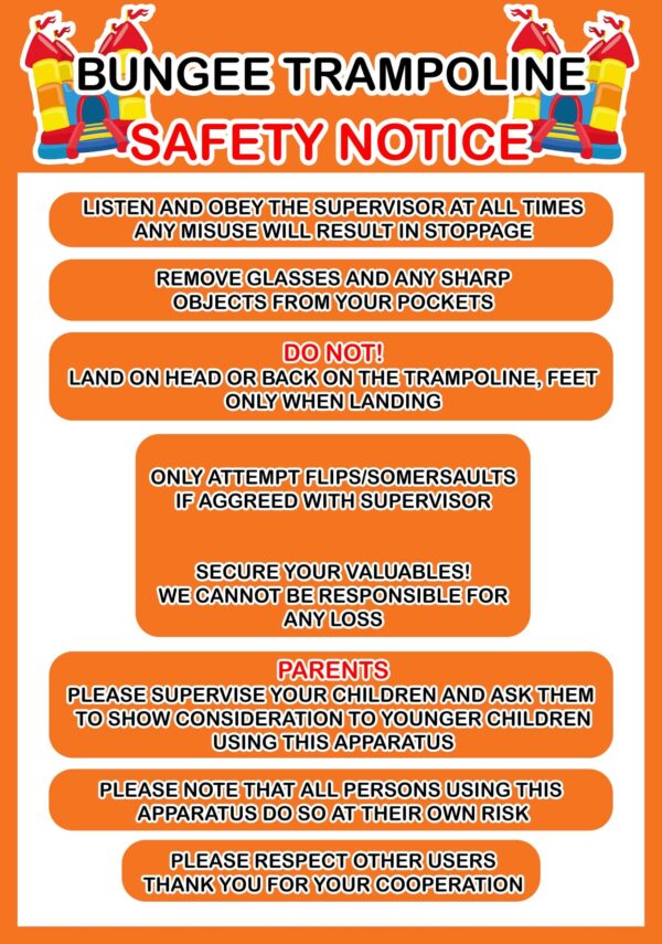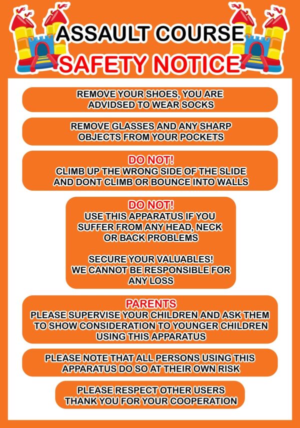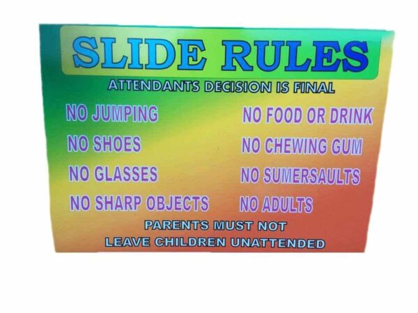 Bouncy Castle Safety Signs for sale delivered across the UK & worldwide daily. A variety of Inflatable Safety Signs from Rodeo Bull & Wipeout Safety Signs to Assault courses & Bouncy Slide safety sign all available to buy. A4 Board with hardback plastic and digitally printed rules to the front of the safety board along with logo.