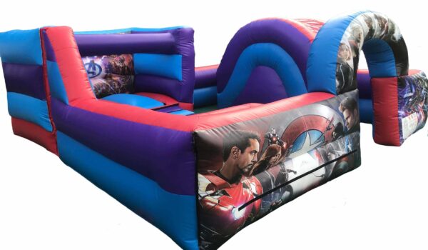 Toddler Activity Play Park for sale in the style of superhero theme which includes digitally printed vibrant artwork at no extra cost. This superb inflatable toddler activity play centre is ideal for indoor & outdoor use which includes a variety of items from bouncy castle, float a ball game, toddler up & over bouncy slide and mini corner ball pool all in one contained area wit one entrance & exit point.