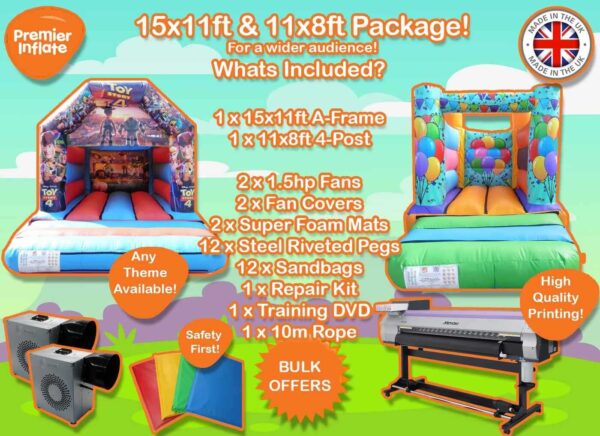 Children's back garden unisex party bouncy castles to buy at affordable low prices constructed using the best UK materials at affordable prices. Our Commercial jumping castles are ideal for hirers who rent out bouncy castles to the public. This package consists of two unisex party inflatable bouncy castles which include digitally printed artwork. Choose your own colours & themes & start hiring today!