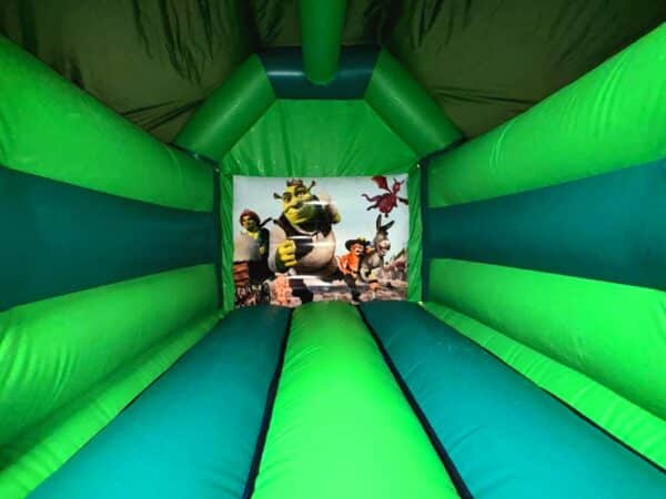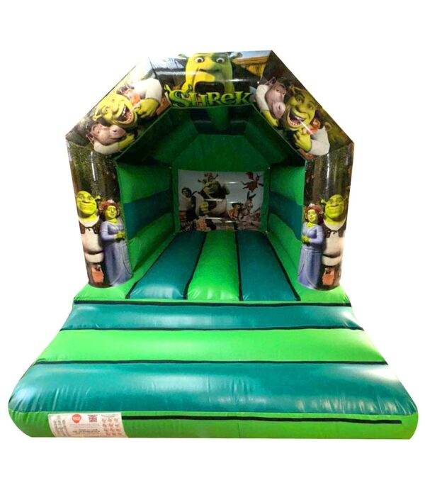 15x11ft AFrame Shrek themed Bouncy castle for sale, also available in a variety of different sizes and styles. This item is definitely one of our most popular sized bouncy castles for kids, which is ideal for back garden use as well commercial bouncy hire too. These particular style of bouncy castles are a manageable weight which are easy to handle and will fit into the rear of a car. Perfect for both boys and girls, this impressive Shrek themed bouncer is bound to draw peoples' attention. This Castle can be made to your specifications i.e. choice of colours, size, style of artwork and can also include your business contact details.