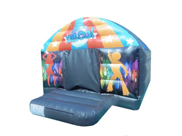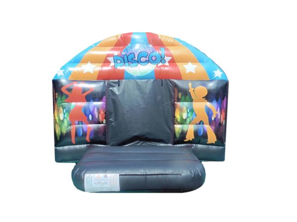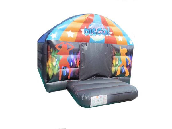 15x12 ft. Adults Disco Jumping Bouncy Castle dome available to buy. A fully enclosed jumping bouncer with dark effect inside which features front flap door and colourful unisex front design. Children & adults go wild for our Disco Party bouncy castles which include LED disco ball light & Bluetooth Speaker system which plays music directly into the inflatable bounce house for extra fun & excitement. Ideal for back garden use. These style bouncers are a manageable weight which are easy to handle and will fit into the rear of a car. Perfect for both boys and girls. This Castle can be made to your specifications i.e. choice of colours, size, style of artwork and can also include your business contact details.