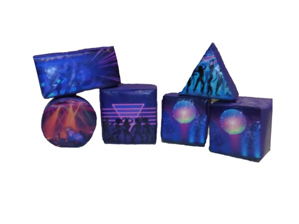 6 Piece Unisex Soft Play Shapes for sale which feature digitally printed disco themed artwork. Includes FREE carry bag all complete with a unisex design & colour scheme.