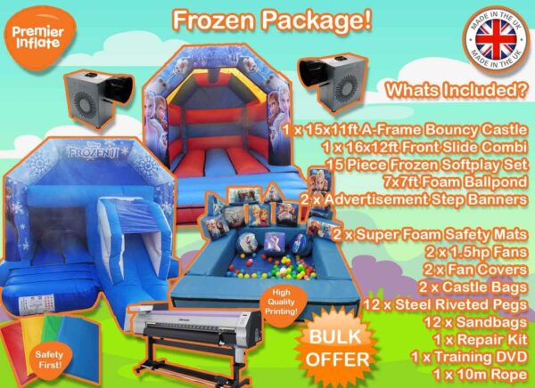 Popular Bouncy Castle Package deal for Sale which includes a 15x11ft Bouncer, 16x12ft Front Slide Combo and Soft Play all of which are completed with digitally printed artwork of your choice. Want to adapt any of our packages such as sizes, designs or artwork just let us know and we can do a bespoke package quote for you.