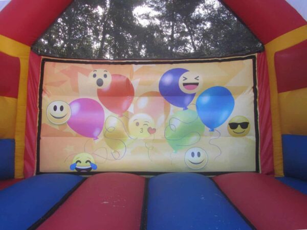 15 x 12ft Emoji Bouncy Castle which has fun and vibrant digitally printed artwork to complete the look. This Bouncer includes reinforced webbed beds, back wall netting and fully sewn on rain cover to provide extra safety for users.