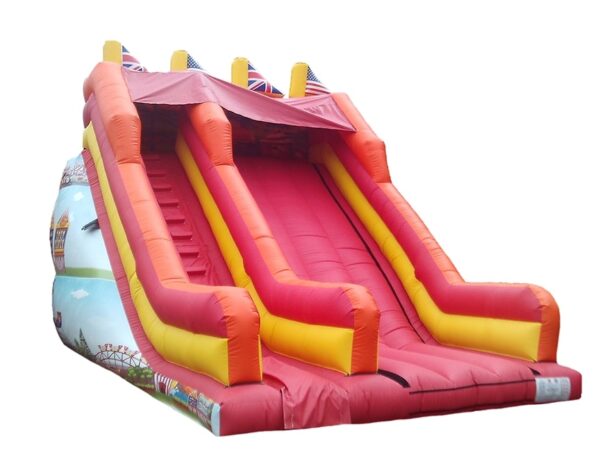 A 15 ft. Platform Fairground Bouncy Slide to buy in a variety of colours & themes. A super bouncy slide with digitally printed artwork which is ideal for large corporate events such as festivals, car boots & town park bouncy hires. Perfect for both boys and girls. This Bouncy Castle Slide can be made to your specifications i.e. choice of colours, size, style of artwork and can also include your business contact details.