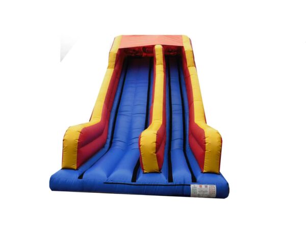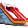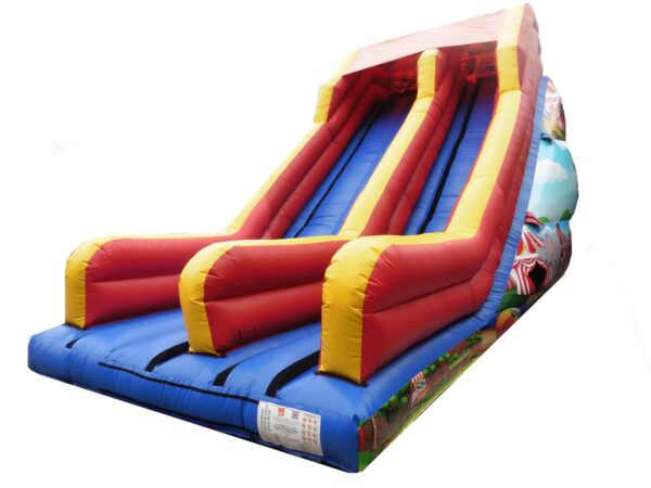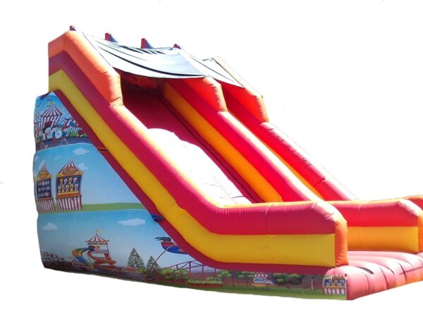 15ft. Platform Bouncy Slide with fairground digitally printed artwork available for sale in unisex colour scheme. This Popular inflatable bouncy slide is a real crowd pleaser ideal for both boys & girls. Includes Slip & Climb Sheets.