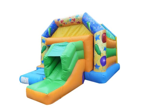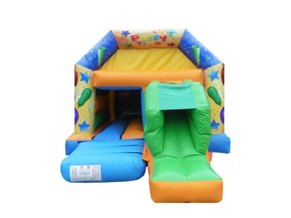 Digitally Printed Party artwork Front facing slide combination bouncy castle in unisex colours ideal for both girls & boys for sale. This Front slide combo has a great sized internal bounce space as well as built in shower cover. Easily one of the most popular sized bouncy castles for sale which is ideal for back garden use. These style bouncers are a manageable weight which are easy to handle and will fit into the rear of a car. Perfect for both boys and girls. This Castle can be made to your specifications i.e. choice of colours, size, style of artwork and can also include your business contact details.