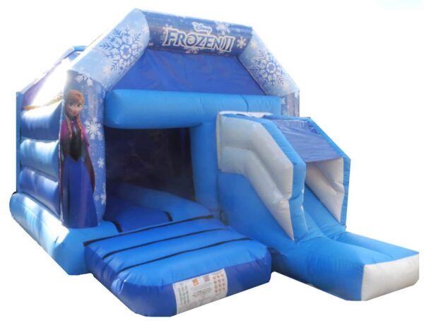 16 x 12ft Frozen Front Slide Combi Bouncer available to buy. Massively popular theme and especially appealing to girls. Great design combi bouncer which is easier to fit in back gardens.