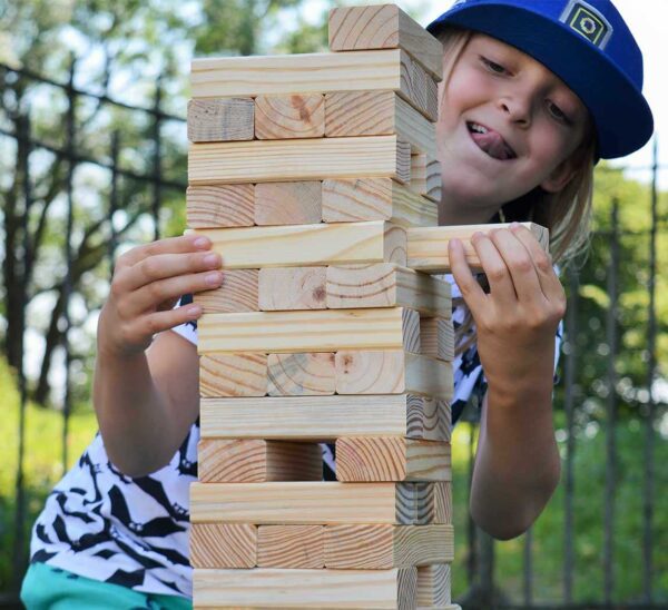 Build the tower and then take turns to remove a piece without making the whole tower tumble. The winner is the last person to remove a piece and replace it on the top of the tower, leaving the whole tower standing. This size of tower is ideal for children as well as adults, and is suitable for playing indoors and out. Perfect for BBQ's, parties, family gatherings or just a little fun in the garden.
