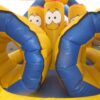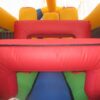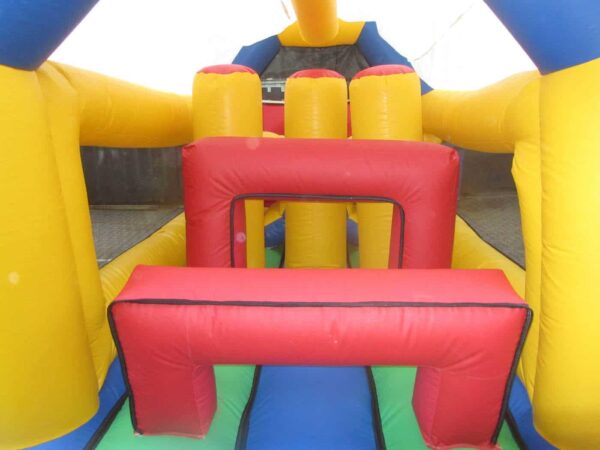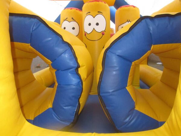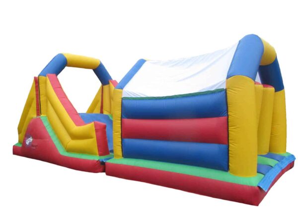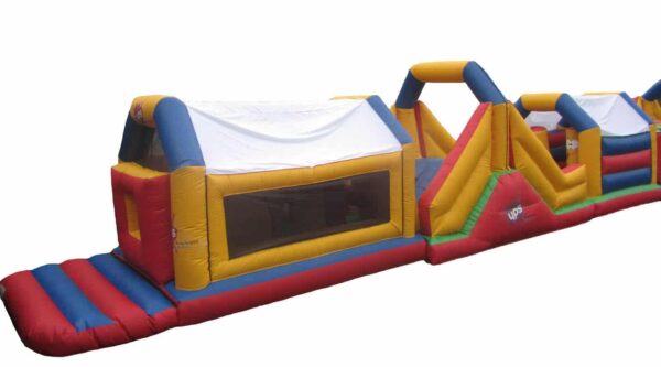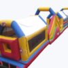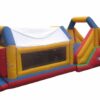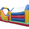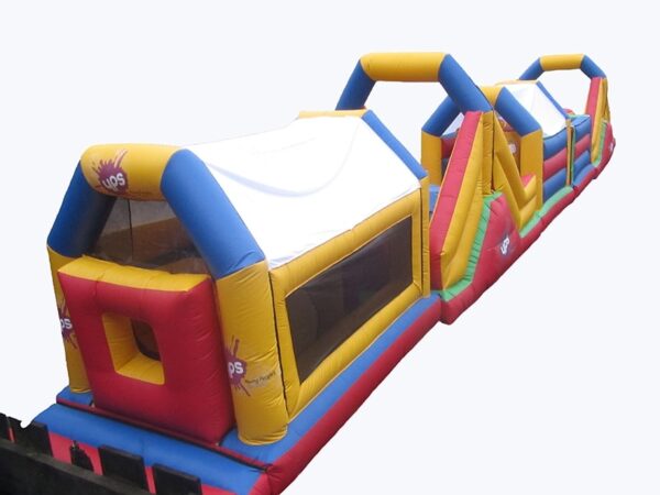 80x11 ft. Commercial Bouncy Obstacle Course with branded artwork and multiple inflatable obstacles hidden in each part. This Jumping Obstacle course consists of five parts with two up & over Slides (5ft & 7ft Platform slides) as well three sections jam packed with obstacles from cross beams, biff bash, crawl tunnels, Up & Over bars etc. The Ultimate obstacle for any event!