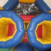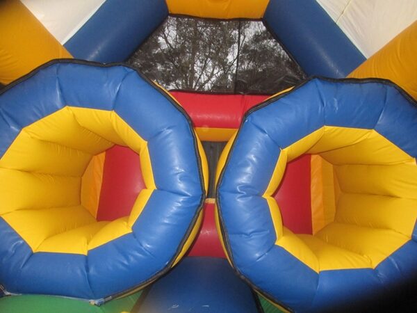 34x11 ft. Commercial Bouncy Obstacle Course for sale which features up & over 5ft. Slide and Bouncy Obstacle first part with netted sides for clear observation of participants. Includes internal Biff & Bash pillars & Tunnels. This Inflatable Bouncy Ob Course to buy comes in two pieces which are connected via Velcro. A unisex design which is great for both boys and girls. Add your own logo/details with digitally printed artwork.
