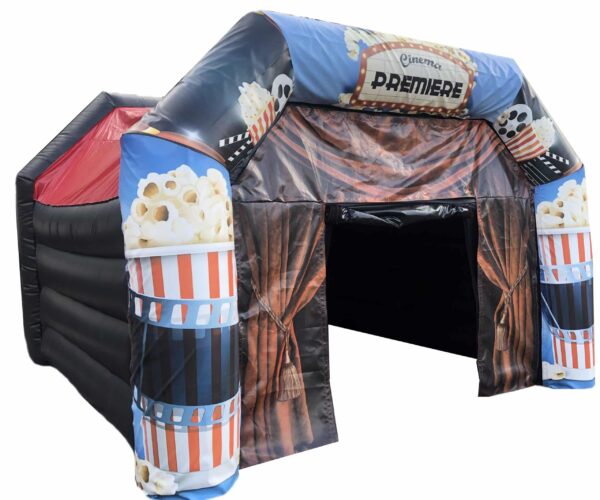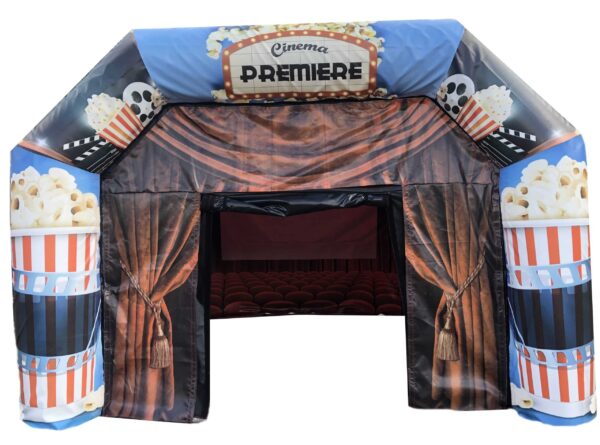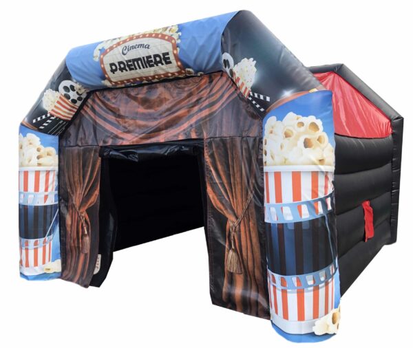 15 x 12ft Cinema Marque for Sale with vibrant digitally printed artwork. This Cinema themed artwork inflatable tent which can either be hand painted or digitally printed includes Bluetooth Speaker and disco light so it has the full effect for any event.