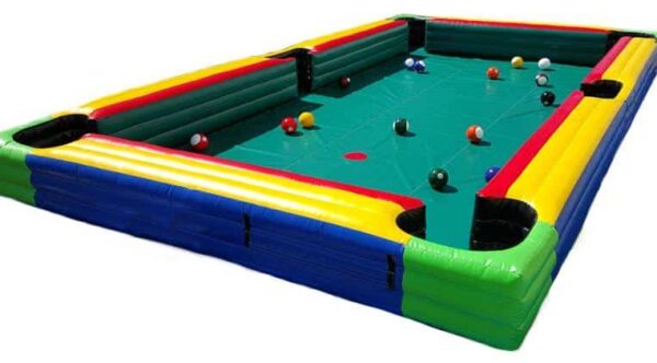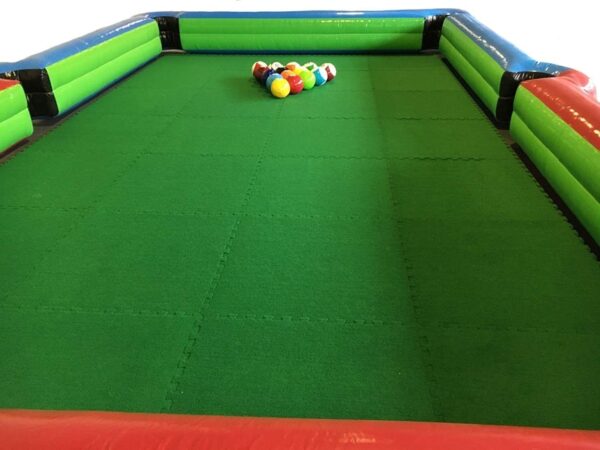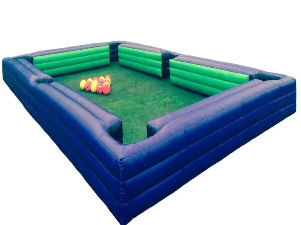 Large Commercial Inflatable Foot Pool Table for Sale. Great for large events, fun days, fates etc as its a real crowd pleaser with this impressive inflatable barrier with pockets like a pool table and the aim of the game is to kick the Pool balls into the pockets.