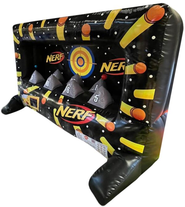 Inflatable Nerf Target Shooter for sale. This is a fully enclosed inflatable shooter where any bullets fired into the target will be kept inside to prevent any from getting lost. The aim of the game is simple, fire the bullets at the balls hovering over the targets and see who scores the highest! A great inflatable game for all ages and brilliant for any occasion such as parties and fun days, the perfect target shooter to bring everyone together.