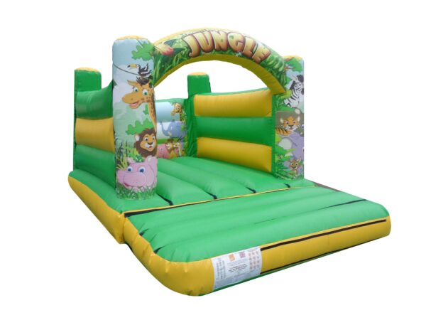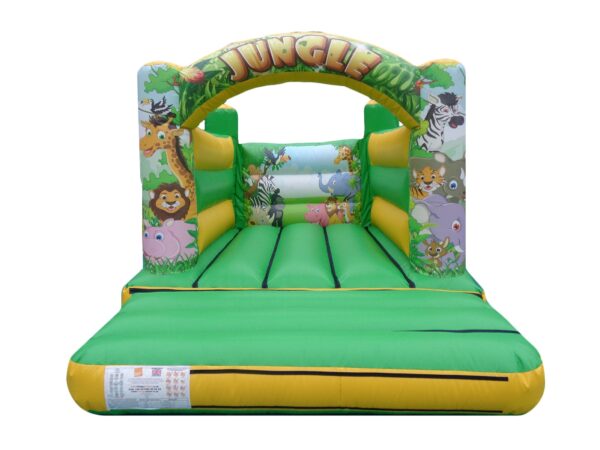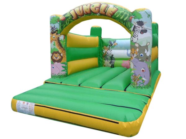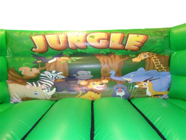 Popular themed bouncy Castle with bold digitally printed Jungle themed artwork. Fully Covered back wall and legs to make the artwork stand out.