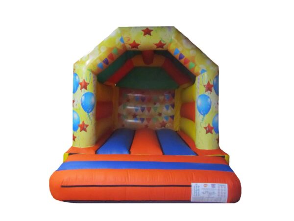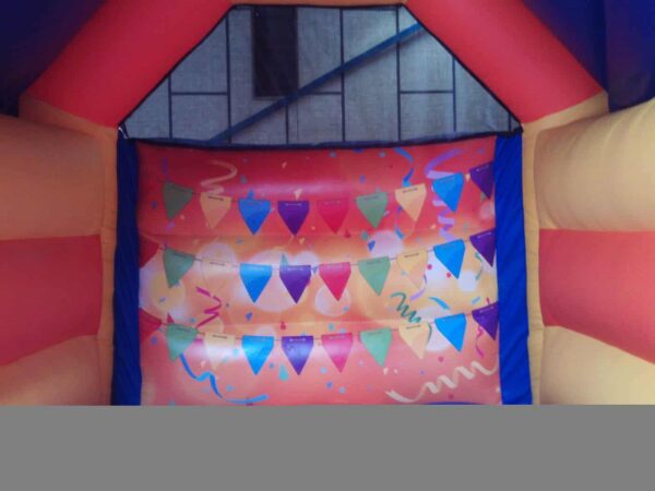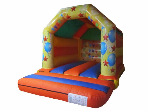 15x11ft Commercial Party Themed Bouncy Castle for sale, this kids bouncer features vibrant digitally printed party artwork and matching unisex colours, making it perfect for both boys and girls. The ideal bouncy castle for any occasion, whether it's personal use, parties or events this party bouncer can cater to all!