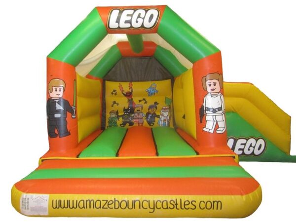 17x15 ft. Lego Bouncy Castle with side slide attachment for sale which is perfect for back garden hires as well as indoor use. A hand crafted detailed artwork which can be upgraded to a digital print. Colourful & robust design. Slip Sheet included.