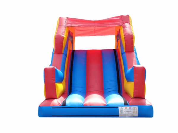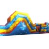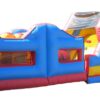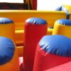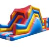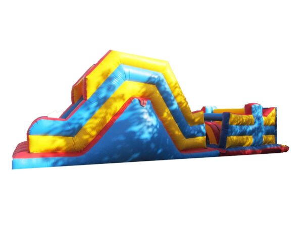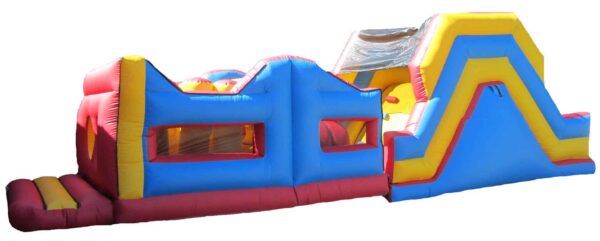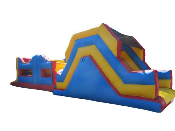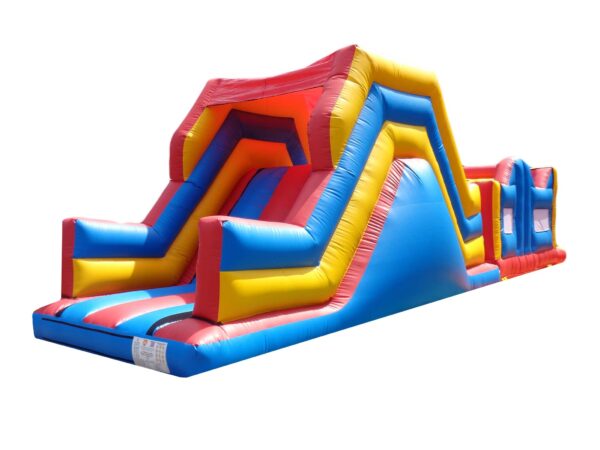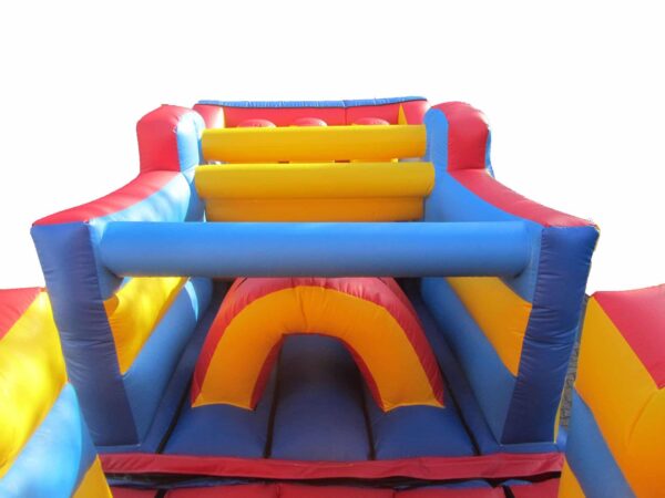 38x11 ft. Bouncy Obstacle Course inflatable commercially built available to buy which includes 7 ft. Up & Over slide and multiple inflatable obstacles hidden inside. This colourful unisex design is a real crowd pleaser at any event. Ideal for both girls & boys. Why not include digitally printed artwork for an extra cost. Now includes high sidewalls to the first part obstacle course.