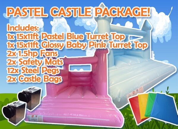 Children's Pastel Bouncy Castles package deal for sale at an amazing bulk price! This package includes a 15x11ft Pastel Blue Turret Top and a 15x11ft Gloss Baby Pink Turret Top. This is the perfect package for both boys and girls, and a great addition to your fleet! Manufactured using the best heavy duty UK materials which are ideal for the bouncy castle hire market.