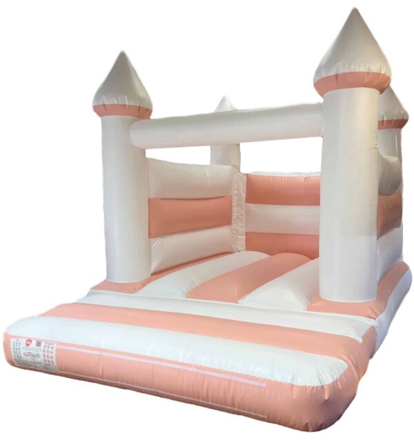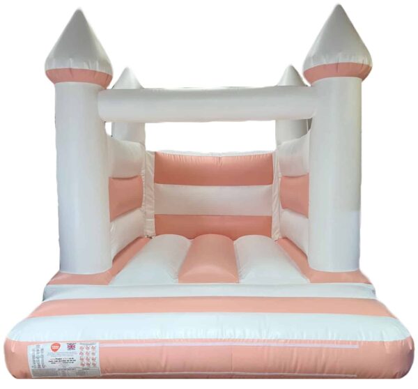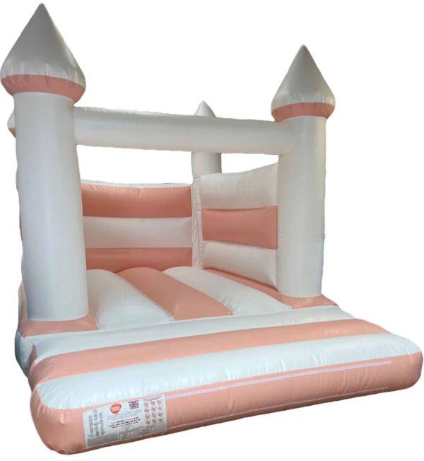 15 x 11 ft Commercial Turret Top Pastel Peach and White Bouncy Castle for sale. Unique Turret Top design and in a Pastel colour it is ideal for children of any age. Perfect Bouncy Castle for weddings / christenings / baby showers or birthday parties.
