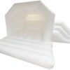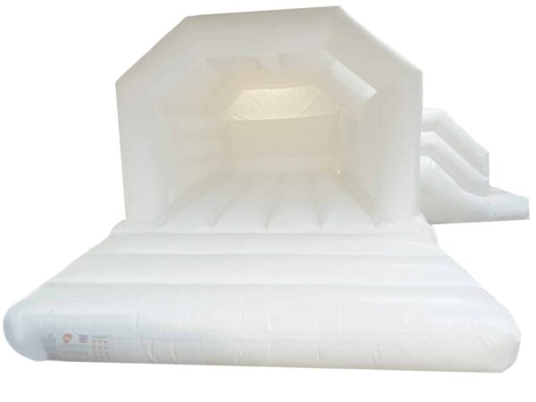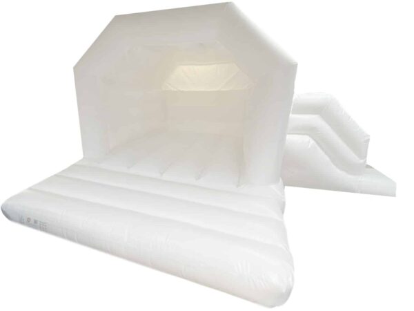 15x19ft. Commercial Bouncy Castle with slide attachment combo for sale with the ever popular neutral colour scheme of White. A unique design which is great for both boys and girls. Includes slide slip sheet. Add Velcro attachments for interchangeable Velcro artwork. Don't forget to check out our soft play set which comes in the same colours and a great add on hire item.