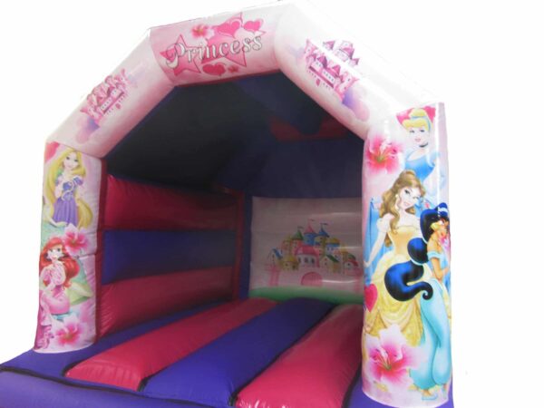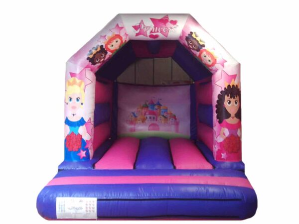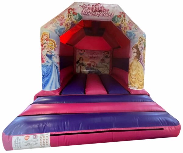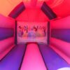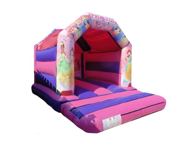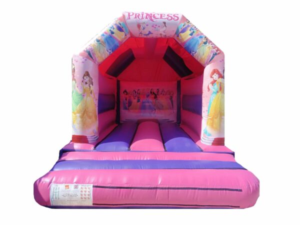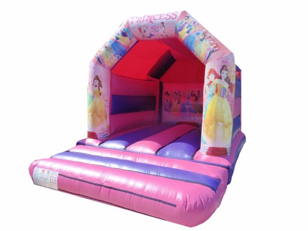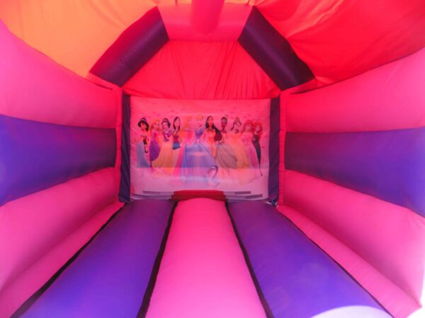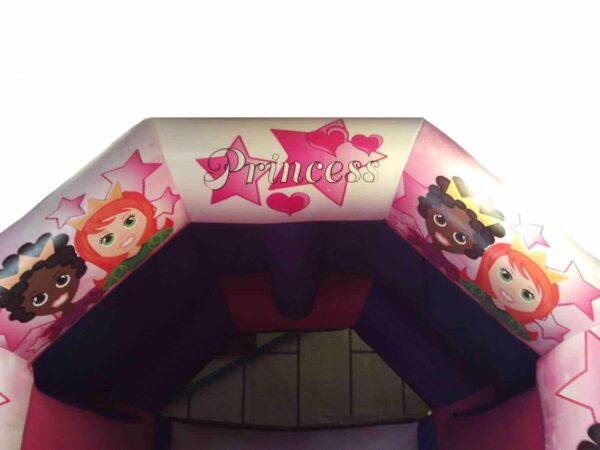 15x11ft Princess Bouncy Castle with printed artwork and themed colours. Premier Inflate can personalise any bouncy castle or inflatable with colours, artwork, business details and we can even upgrade it to have glossy material so please do not hesitate to let us know what you want.