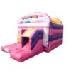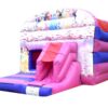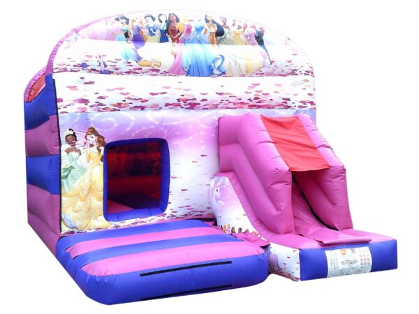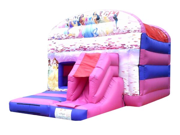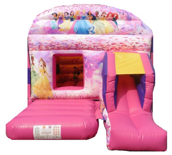 16x12 ft. Commercial Deluxe Printed Princess Themed Front facing slide combo bouncy castle in Themed colours so its especially appealing to young girls. This Front slide combination has a great sized internal bounce space as well as built in shower cover. Slip sheet included.
