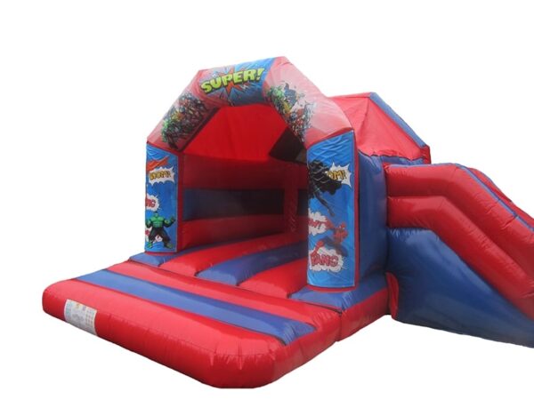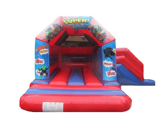 17x15 ft. Commercial Superhero Glossy Combi Bouncy Castle for sale with slide attachment. A massively popular design which is great for both boys and girls. A unisex colourful design with appealing digitally printed artwork to cater to all. A perfect addition to any hire fleet. Add Velcro interchangeable artwork at an additional cost.