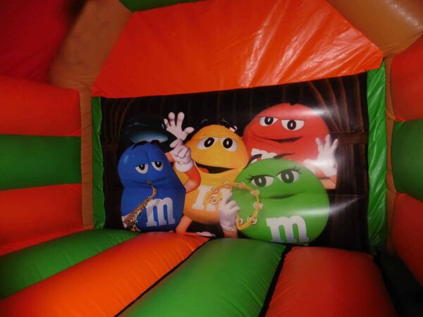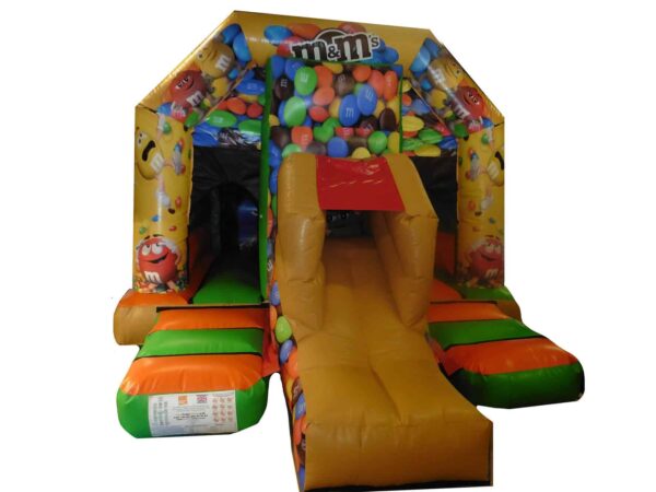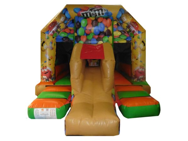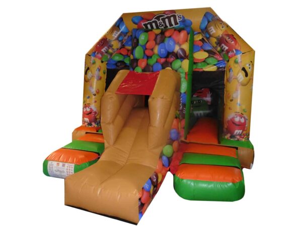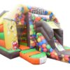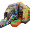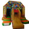 16 x 12ft Commercial Uniquely themed Front slide combi with higher slide to create extra fun. Great design to still be a perfect size for back garden hires and gives something extra to a standard bouncy castle.