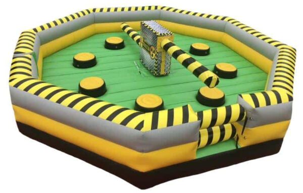 Last man standing mechanical Wipeout system which includes a vibrant & detailed hazardous design with surrounding wall available to buy from a reliable manufacturer of Inflatable Wipeout Games, Rodeo bull beds for sale and a vast variety of heavy duty bouncy castles to buy at competitive prices!