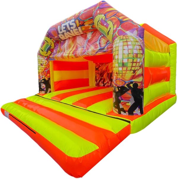 15x15ft Commercial UV Rave Themed Bouncy Castle which has been manufactured with robust 610gsm PVC, has reinforced webbed beds for extra durability, back wall netting and fully sewn on rain cover to stop users from being able to climb on the walls.