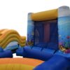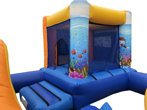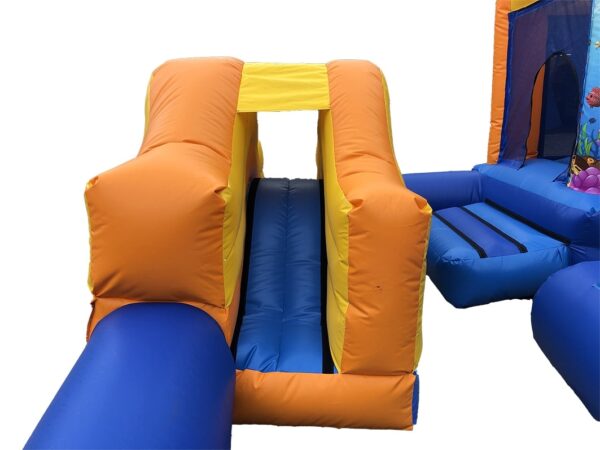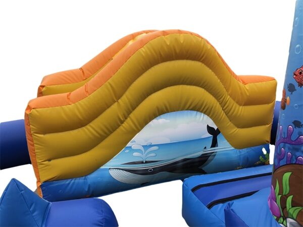 Children's Toddler Activity Play Park Inflatable for sale in the style of a popular Under the Sea theme in a vibrant & bold digital printed artwork at no extra cost. This Robust heavy duty inflatable toddler activity play centre is ideal for indoor & outdoor use which includes a variety of built in inflatable activities from bouncy castle, float a ball game, toddler up & over bouncy slide and mini corner ball pool all in one contained area with one entrance & exit point.