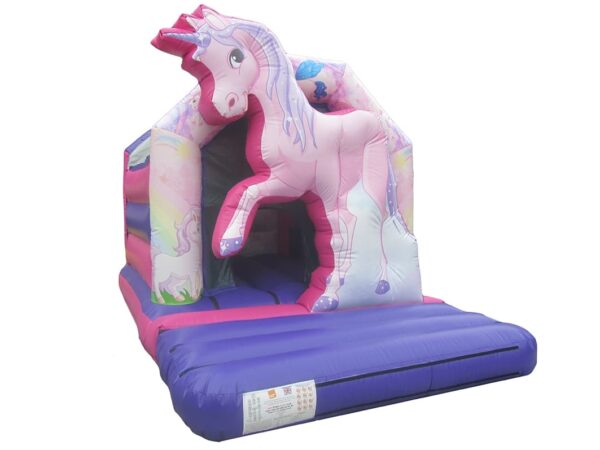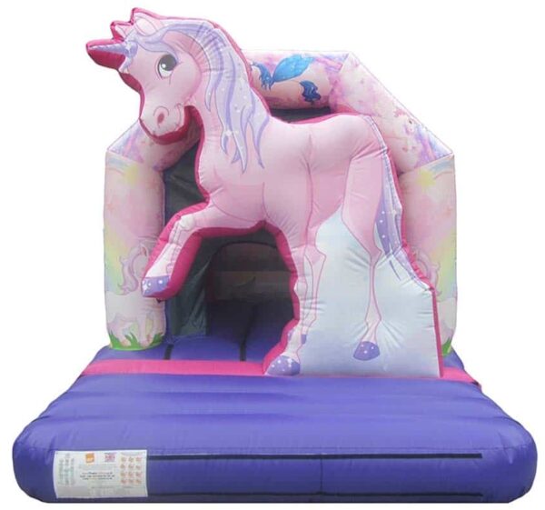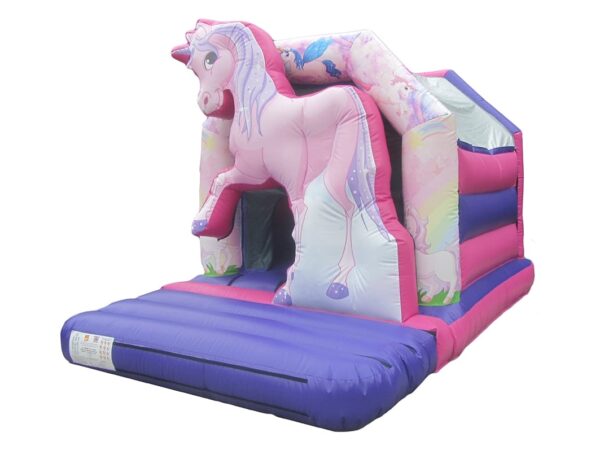 Brand New Premier Inflate design Available with a eye catching 3D Unicorns design at the front of this A Frame Commercial home/rental use Bouncy Castle. Completely Unique design which will really have you standing out in the crowd and complete with vibrant digitally printed Girls themed Unicorns artwork.